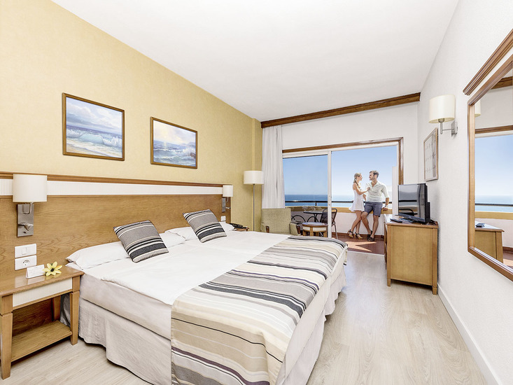 - Doppelzimmer (DJ, ca. 24 qm), gut eingerichtet, Klimaanlage, Minikühlschrank, Tel., TV, Mietsafe. Bad mit Dusche, WC, Föhn. Balkon/Terrasse, wahlweise mit seitlichem (DZ) oder direktem Meerblick (DZM). Max. 3E